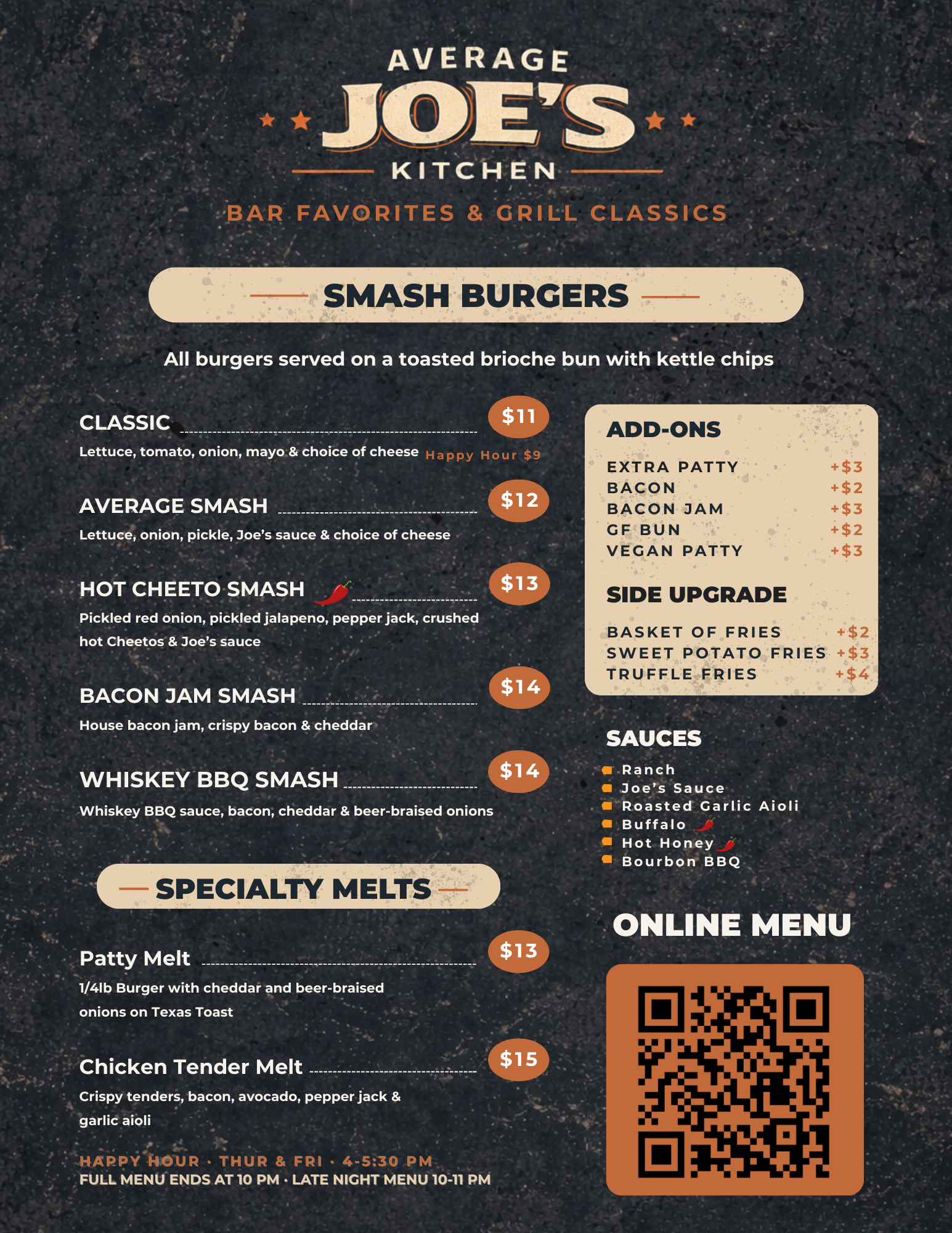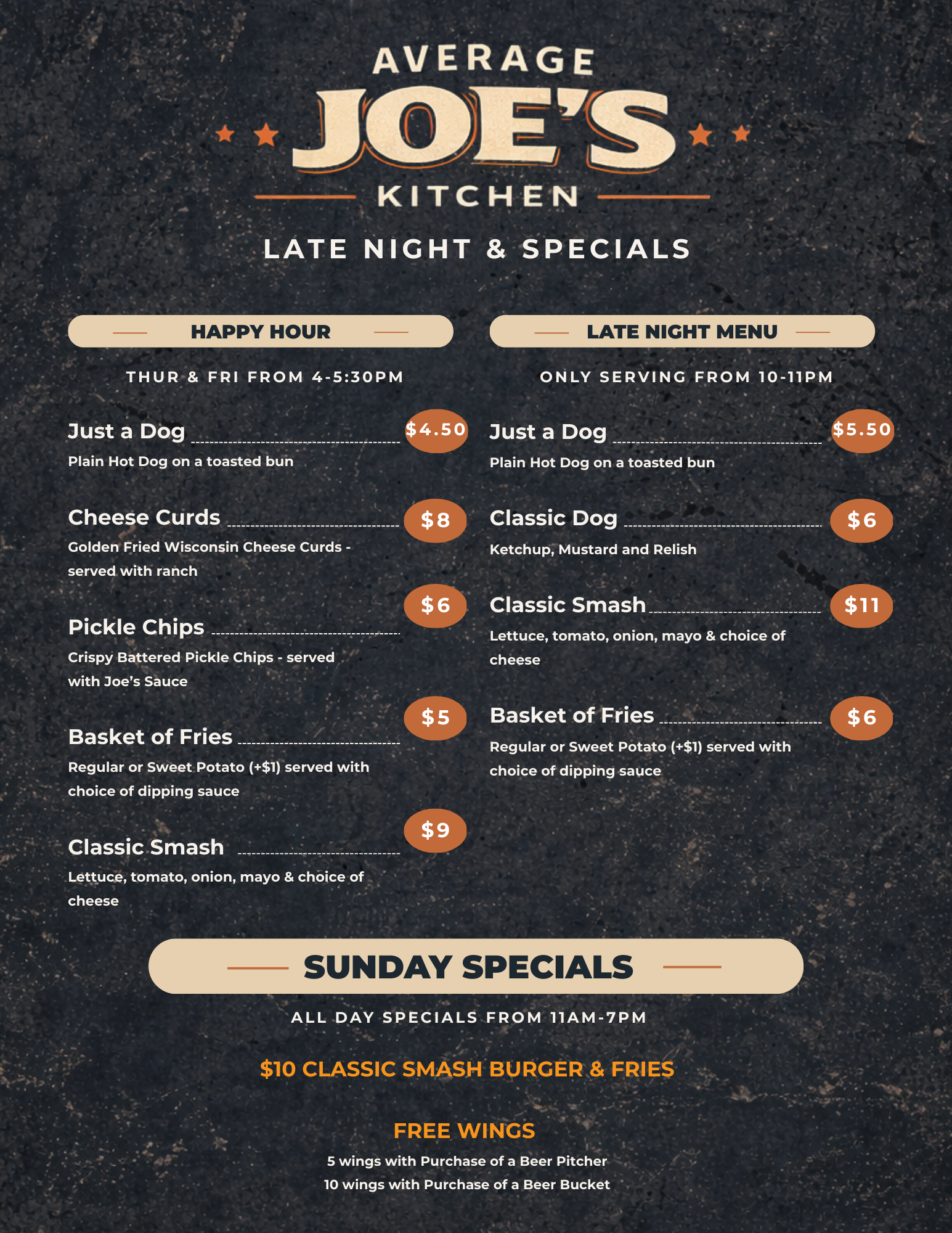 From pool tables and darts to pinball and wall-to-wall TVs, Average Joe’s is built for play. Whether you’re here to compete, catch the game, or just kill some time with friends, there’s always something going on beyond the bar.